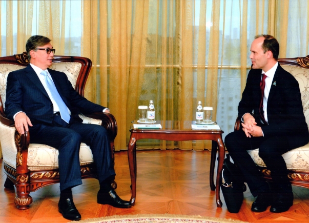 آقای جاشوا لینکلن، دبیر کل جامعۀ جهانی بهائی، در حال ملاقات با آقای قاسم ژومارت توکایف، رئیس دبیرخانۀ کنگره و رئیس سنا.
